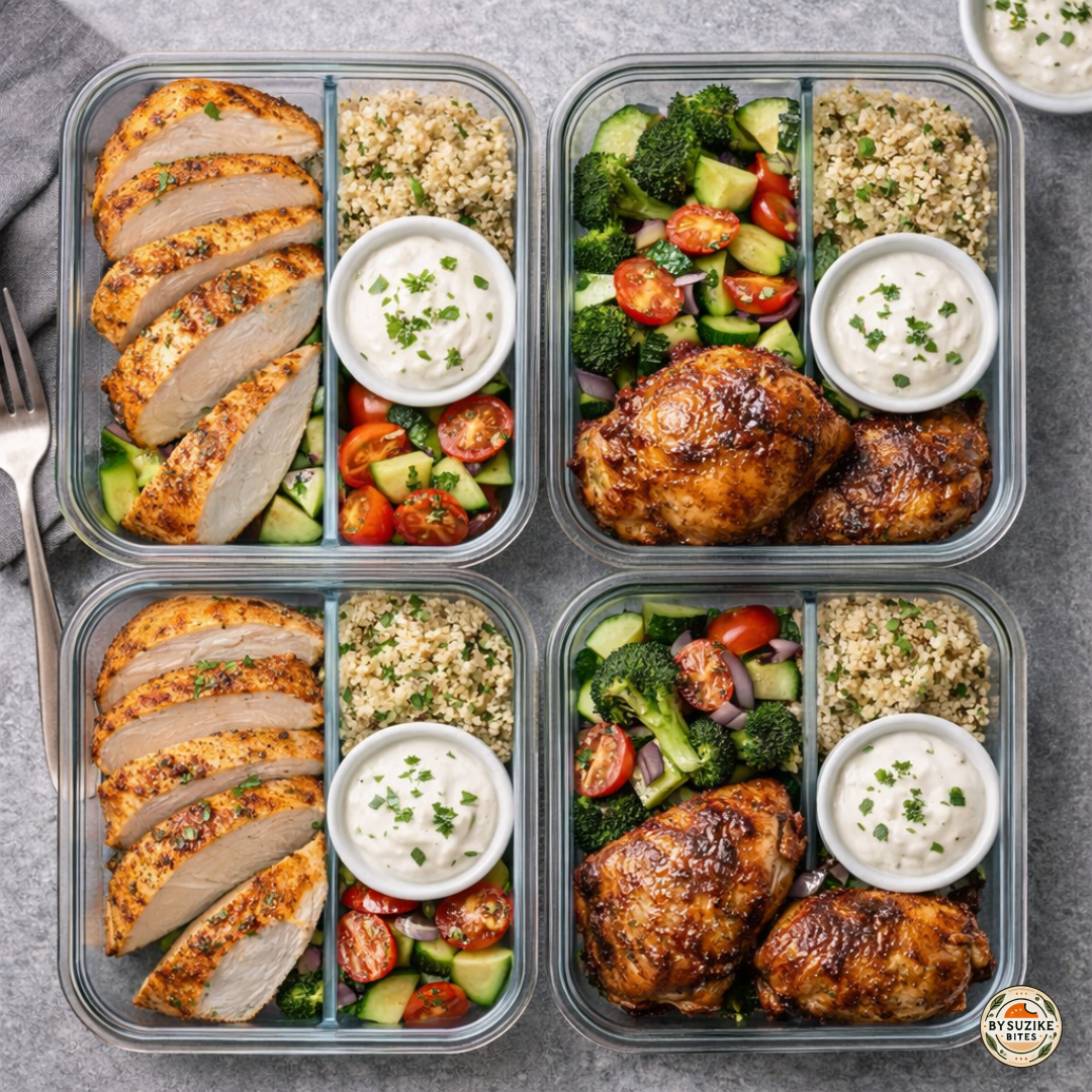 Choose chicken thighs for meal prep if you tend to reheat leftovers, because they stay tender more easily. Choose chicken breast for meal prep if you will slice and eat cold in salads or bowls and you enjoy a lighter feel.