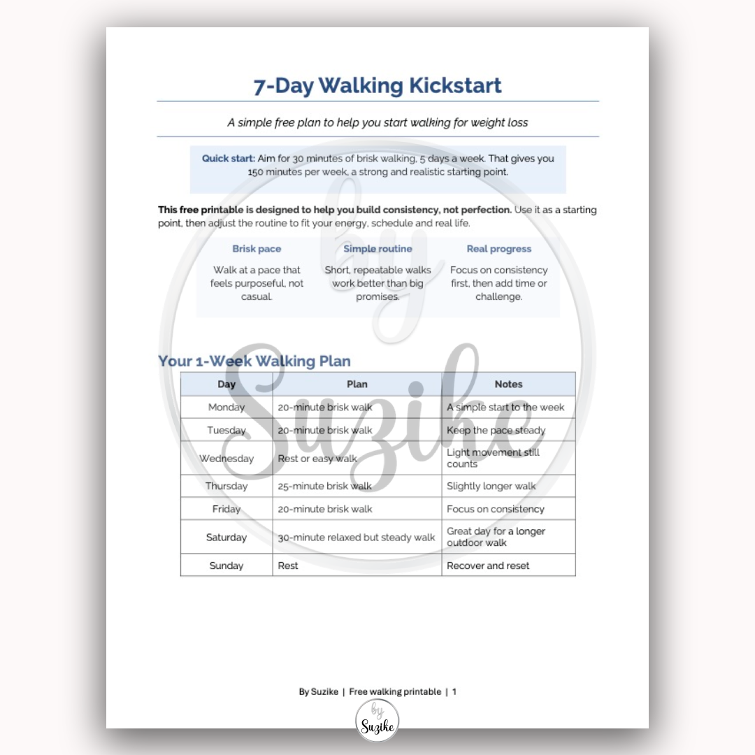 Want to start walking for weight loss without overcomplicating it? This free printable gives you a simple 7-day plan, a daily tracker and a reflection page to help you get moving and stay consistent.