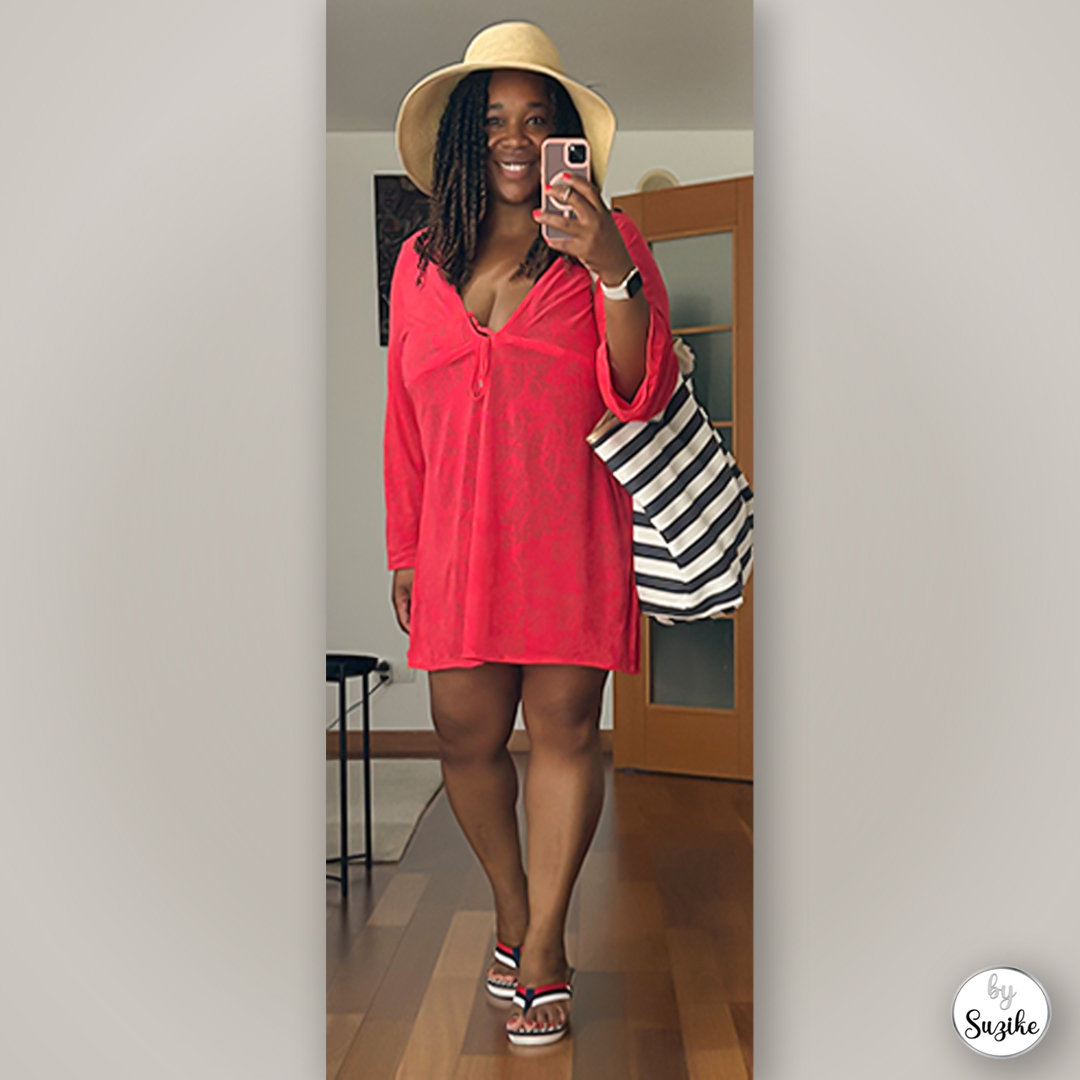 I went for one of my easiest combinations: a bright red swimsuit cover-up, my striped tote bag, a beach hat and my everyday sandals. It’s an outfit I reach for when I want to feel fresh, comfortable and put-together with almost no effort.